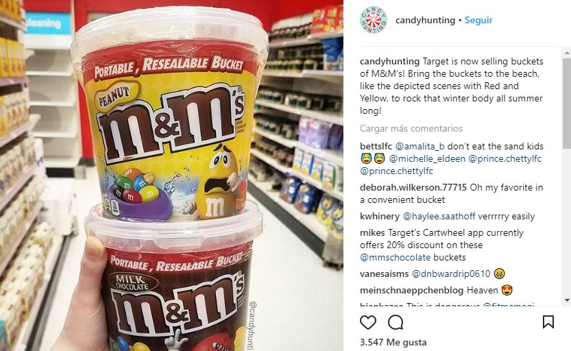El usuario de Instagram @candyhunting ha compartido en su cuenta una foto de dos de estos cubos de M&M, uno lleno de M&M de chocolate con leche y el otro con Peanut M&M’s.