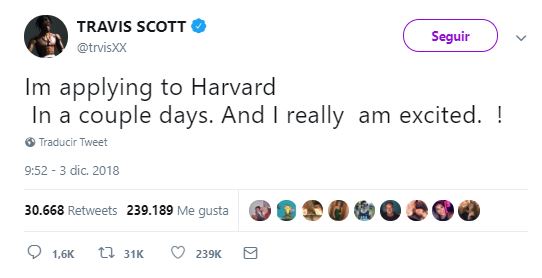 Travis Scott a Harvard. Sí, tal y como lo has leído.Tras conseguir su primera canción número 1 en las listas de Billboard Hot 100 por su canción “Sicko Mode” con Drake, Travis Scott vuelve a estar en el centro de los focos con un sorprendente anuncio.